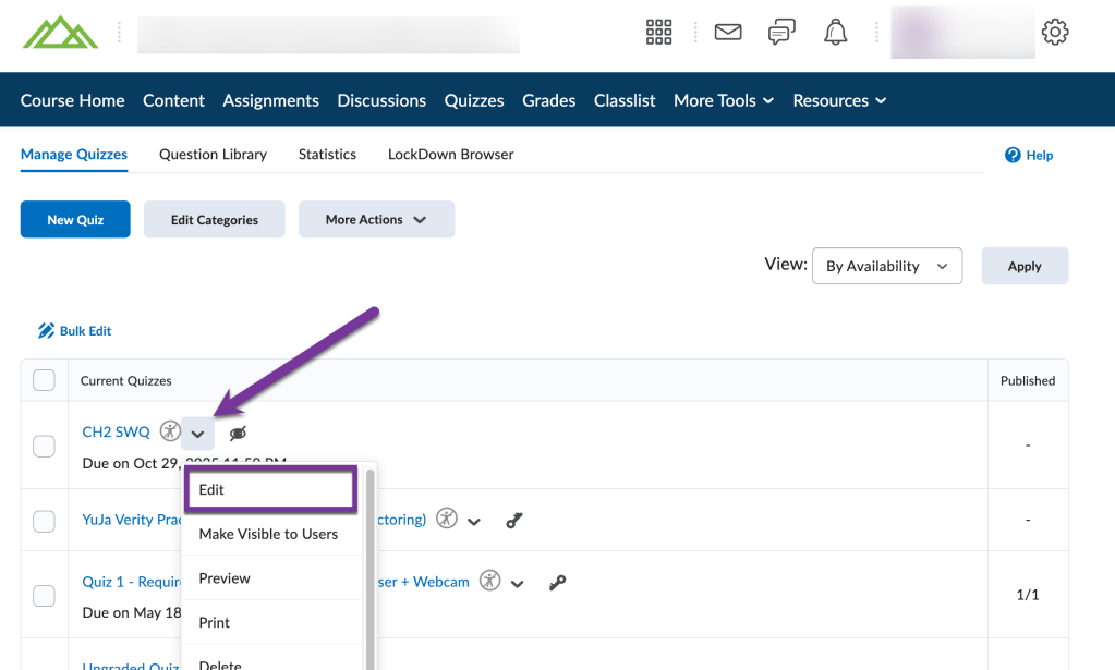 To add a time limit to a quiz, you’ll first either need to create a quiz, or edit a quiz by clicking the down arrow next to the title of the quiz and selecting “Edit.”