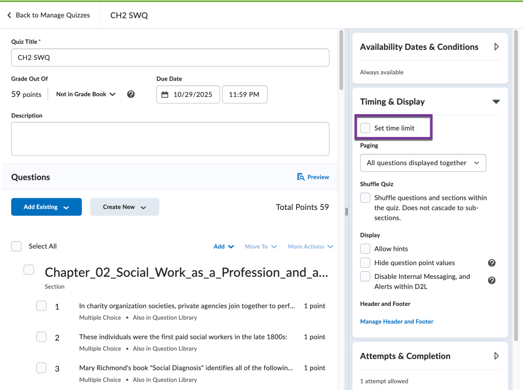 Note: If students have already started taking their quiz, a quiz timer can not be enforced after the fact. Make sure you have the timer in place before students begin taking the quiz.
