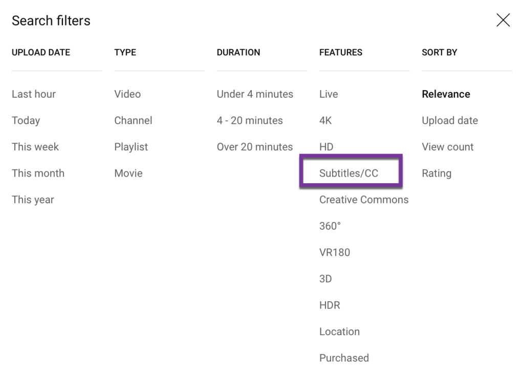 Searching for videos that have captions on YouTube, can be done by completing the following steps: