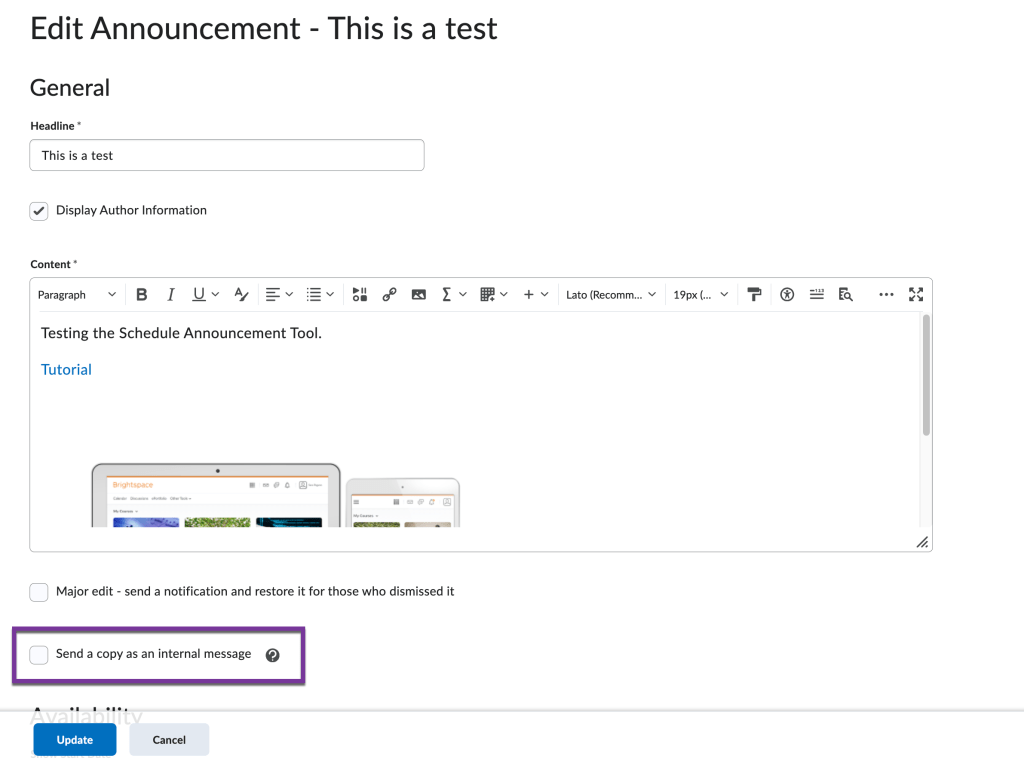 Upon clicking “Update” if editing an announcement or “Publish” if creating a new announcement, a copy of your announcement will be sent to your students via D2L internal email.