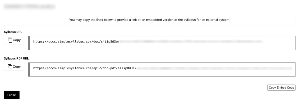 You will then have the option to share a web version of the syllabus (Syllabus URL), or a PDF version of the syllabus (Syllabus PDF URL). Click the “Copy” button to copy the link to your clipboard. You can now paste this link in an email to your students, or anywhere else you would like to share the link.
